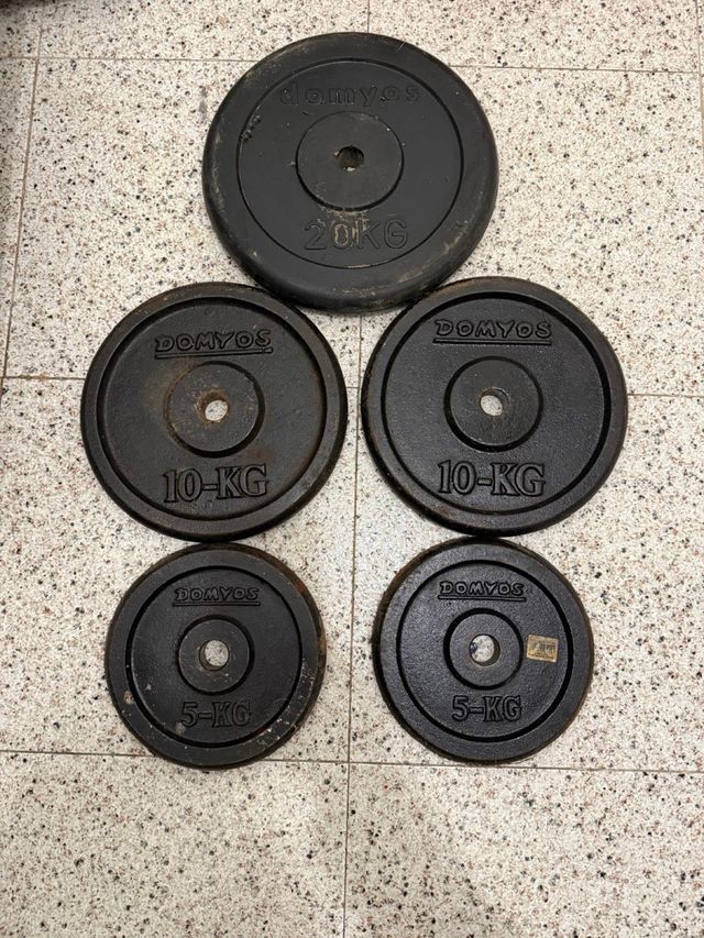 Conjunto de discos de pesas Domyos. - Un disco de 20 kg. - Dos discos de 10 kg. - Dos discos de 5 kg. - Barra de 1,60 m.