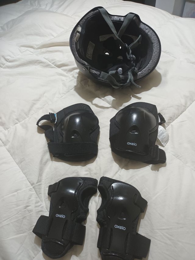 Set de protectores Oxelo Talla XS. Casco y protecciones color negro.