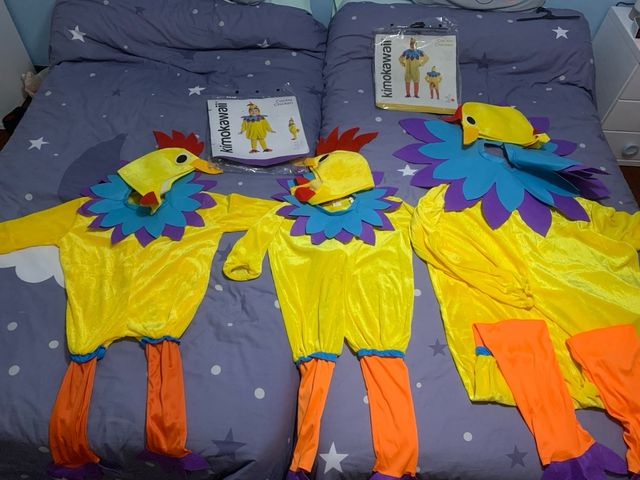 - Disfraces de gallina amarillos con detalles en azul y morado.