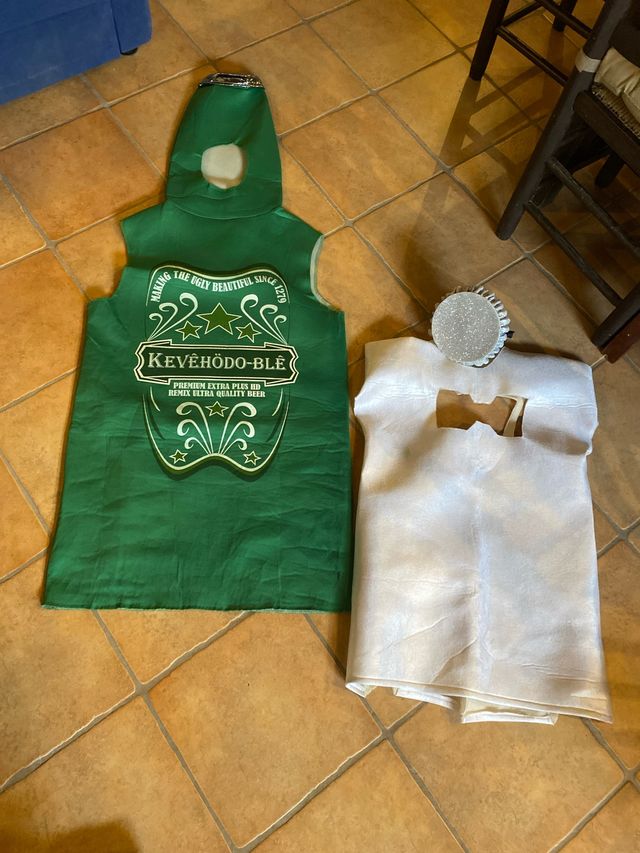 Pack de 6 disfraces. disfraces de botellin de cerveza adulto talla L y 3 de abridor con deadema de chapete niño 8-10