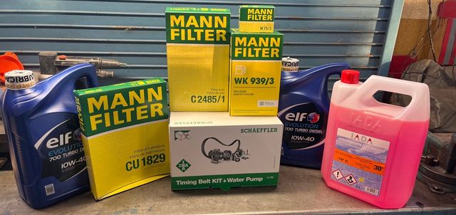 Detalles del productoLote de recambios para coche, ideal para mantenimiento. Pack aceite, anticongelante, filtros y kit bomba agua y distribución.