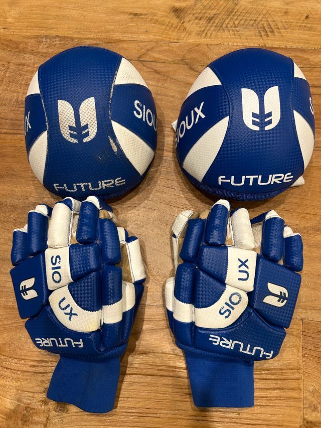 Pack de guantes y pelotas para hockey sobre patines. - Guantes de color azul y blanco. - Pelotas de color azul y blanco.