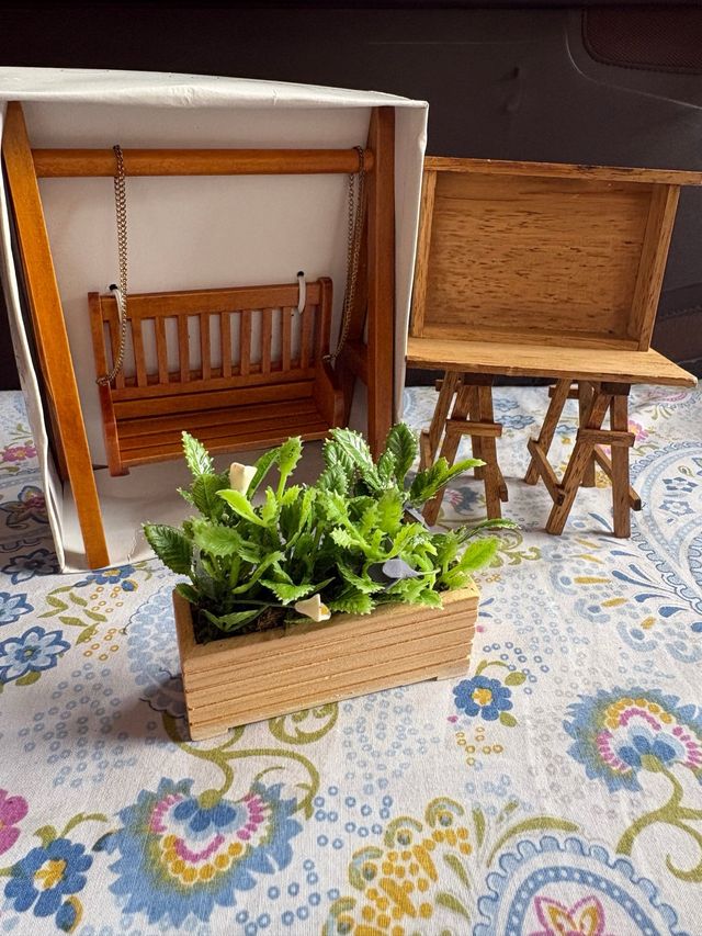 Conjunto de accesorios para casa de muñecas con temática de jardín. - Columpio de madera. - Mesa de madera con caballetes. - Maceta de madera con plantas verdes.