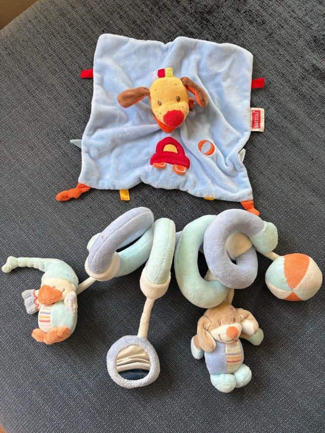 Detalles del productoPack de juguetes para el coche o el carrito del bebé. Incluye un doudou de perro y un sonajero en espiral con figuras.