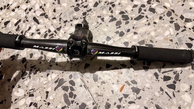 Conjunto de manillar Mssi y potencia de carbono de la marca Deda 0. - Manillar de carbono. 510mm - Potencia de carbono. 80mm - Puños incluidos. (con bastante desgaste)