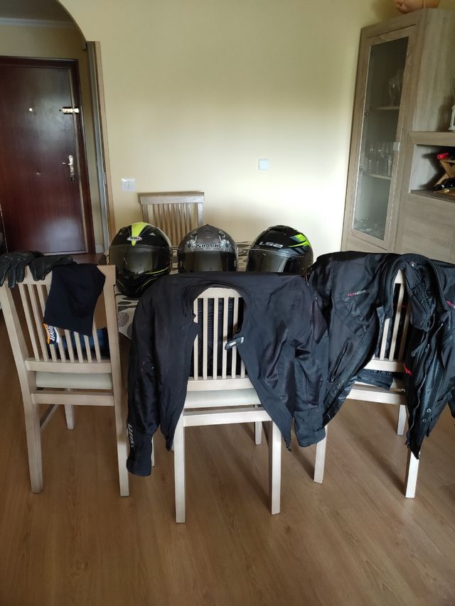 Detalles del producto4 cascos de moto talla M (uno de ellos sin estrenar y con visera para el sol + 2 chupas talla M de invierno y de verano + 2 pares de guantes de invierno + 2 bragas (una sin estrenar) + soporte móvil sin estrenar + 2 pares de pantalones de lluvia talla L + cadena + spray, precio por pack completo pero pregunta por separado!