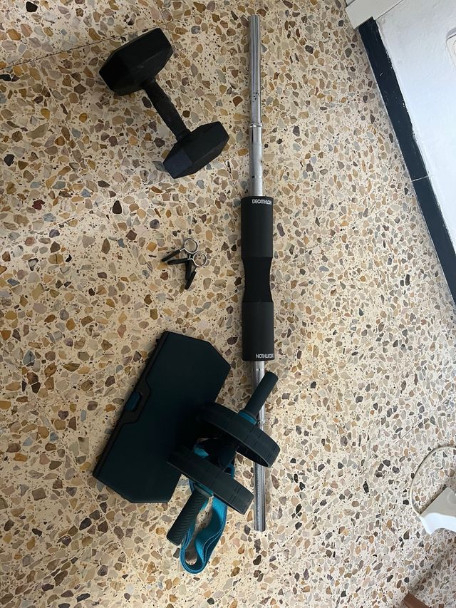 Detalles del productoPack de equipamiento para entrenar en casa. Incluye una mancuerna, una barra y una rueda abdominal.