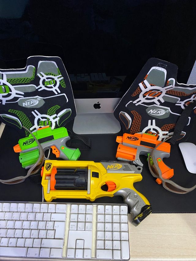 Pack Nerf, el cual consiste de: 2 chalecos adhesivos, 2 gafas protectoras, 2 pistolas pequeñas y 1 de tamaño mayor, no dispongo de ninguna flecha.