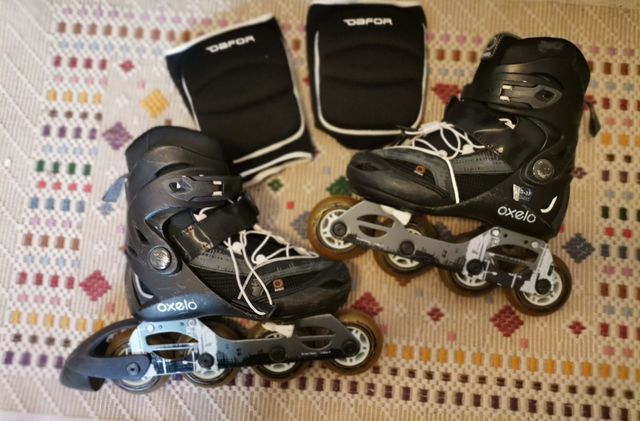 Detalles del productoVendo pack de patines en fila con pareja de rodilleras y funda para llevarlos. También puedo vender los patines sin rodilleras o funda.
