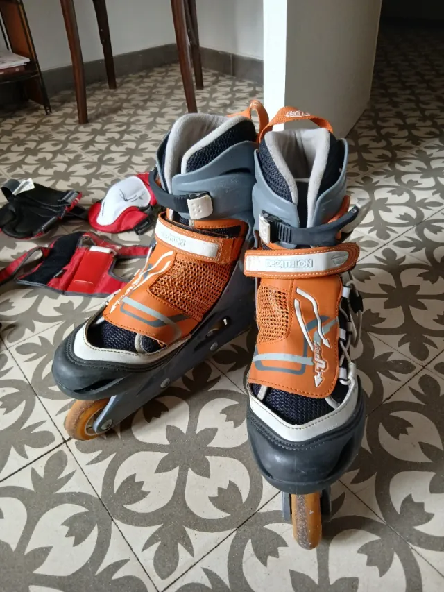- Patines en línea color naranja y gris.