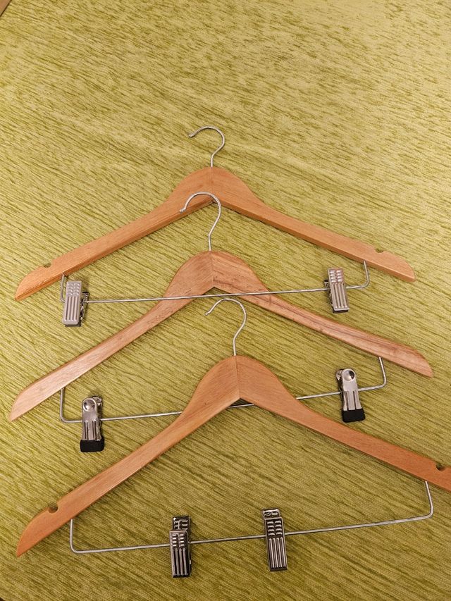 Detalles del productoPack 3 perchas de madera para traje con pinza para falda o pantalón.