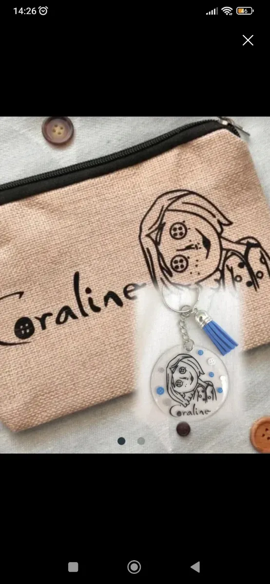 Conjunto de artículos inspirados en Coraline, incluye neceser y llavero
