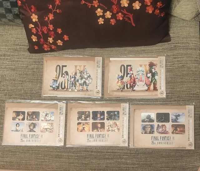 Detalles del productoPack de postales conmemorativas del 25 aniversario de Final Fantasy 9. Son 5 set en total, incluyendo cada uno 3 postales y un sobre. Están precintadas y son oficiales de Square Enix y exclusivas de la lotería de Kuji de Japón. Se venden juntas.