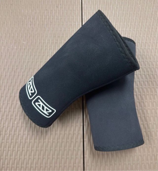 Pack de powerlifting de la marca PBS. -Dos juegos de rodilleras talla S y unas medias - Color negro. - Diseño con detalles blancos.