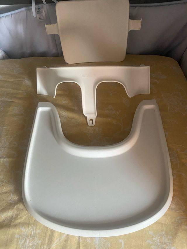 Pack de accesorios para trona Stokke, incluye bandeja y acolchado. - Bandeja de plástico blanco. - Cojín acolchado para la trona. - accesorio bay