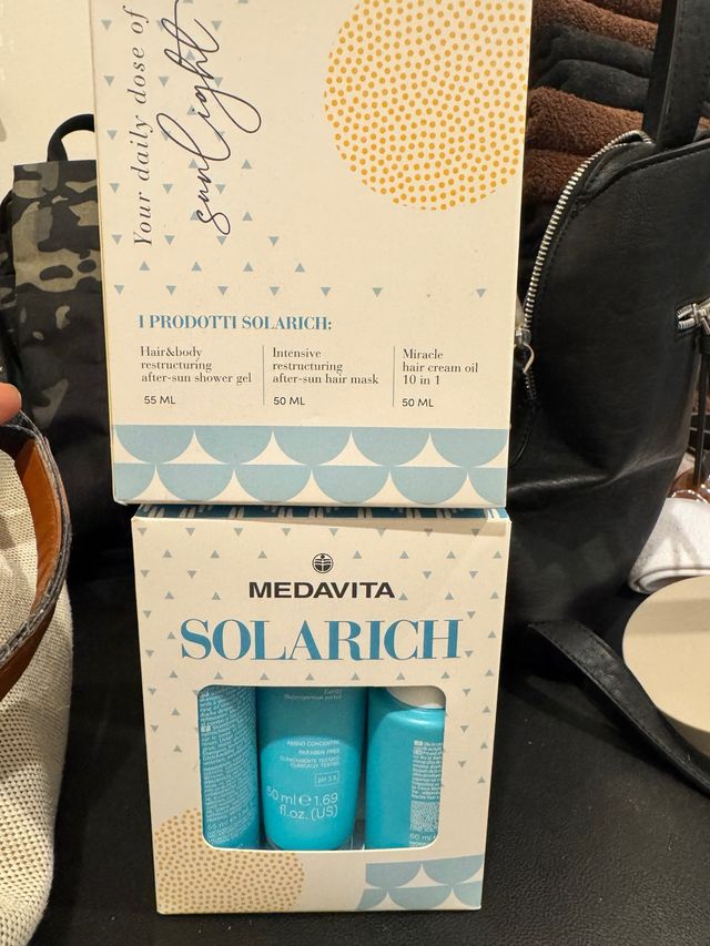 Este pack de viaje Medavita Solarich incluye productos para el cuidado capilar y corporal.