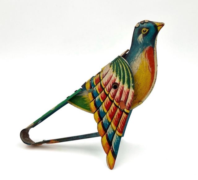 Detalles del productoUn encantador juguete vintage de hojalata en forma de pájaro. Este colorido juguete es un bonito detalle para cualquier colección o como adorno decorativo.