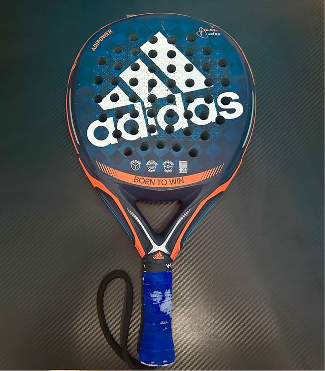 Pala de pádel Adidas Adipower Born To Win. Diseño en tonos azules y naranjas. Tiene marcas de desgaste de ahí su precio. ❌PRECIO NO NEGOCIABLE❌