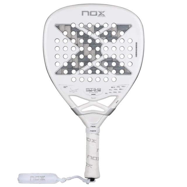 Pala de pádel AT10 Luxury Genius Attack 12K Alum XTREM. - Diseño en color blanco. - Acabado con detalles en gris y negro. - Correa de muñeca.
