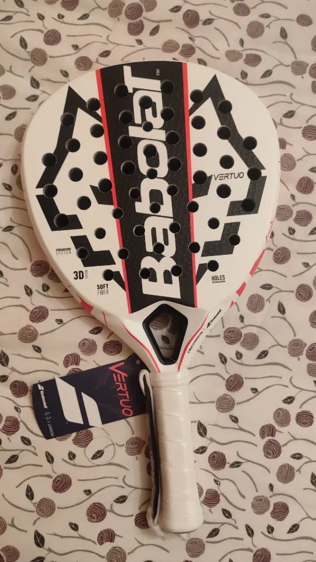 Detalles del productoPala de pádel Babolat Vertuo Lebrón, modelo 2025. Diseñada con un acabado blanco y detalles en negro y rojo.