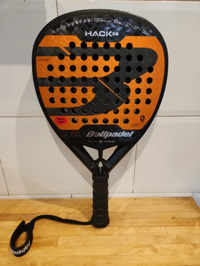 Detalles del productoPala de pádel Bullpadel Hack 03 con un diseño llamativo en negro y naranja.