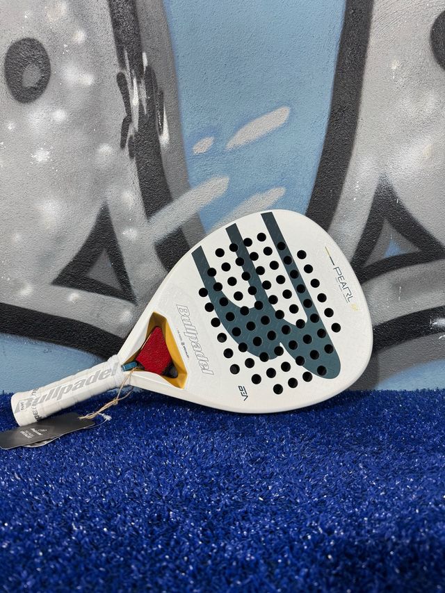 Detalles del productoPala de pádel Bullpadel Pearl, modelo de Bea González. Diseño blanco con detalles en gris y amarillo.