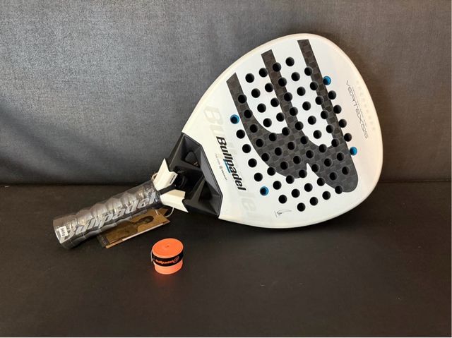 Pala de pádel Bullpadel Vertex 03 con diseño blanco y negro. - Marco con protector. - Grip Bullpadel. - Incluye overgrip naranja.