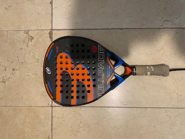 Detalles del productoPala de pádel Bullpadel Vertex Pro Line con un diseño llamativo en negro, naranja y azul.