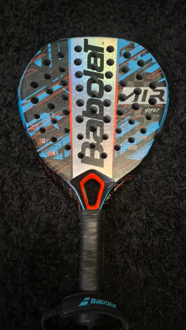 Detalles del productoPala de pádel Babolat Air Viper con un diseño llamativo en azul y negro.