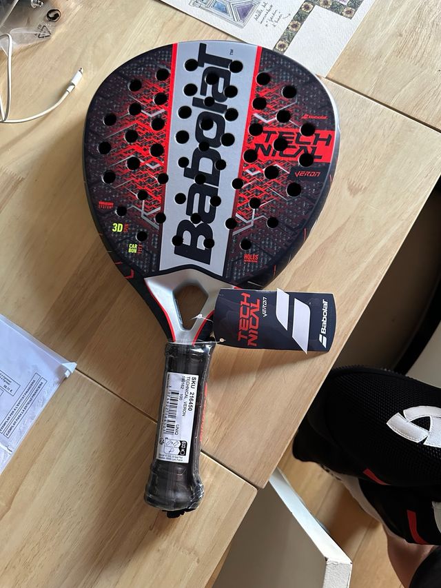 Pala de pádel Babolat Technical Veron en color negro, rojo y plateado. Por estrenar. - Marco de carbono. - Superficie 3D. - Agujeros.