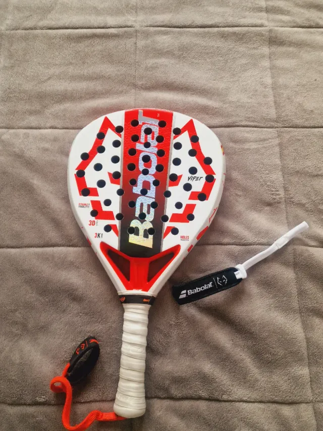 Detalles del productoPala de pádel Babolat Viper 3K con diseño llamativo en blanco, rojo y negro.