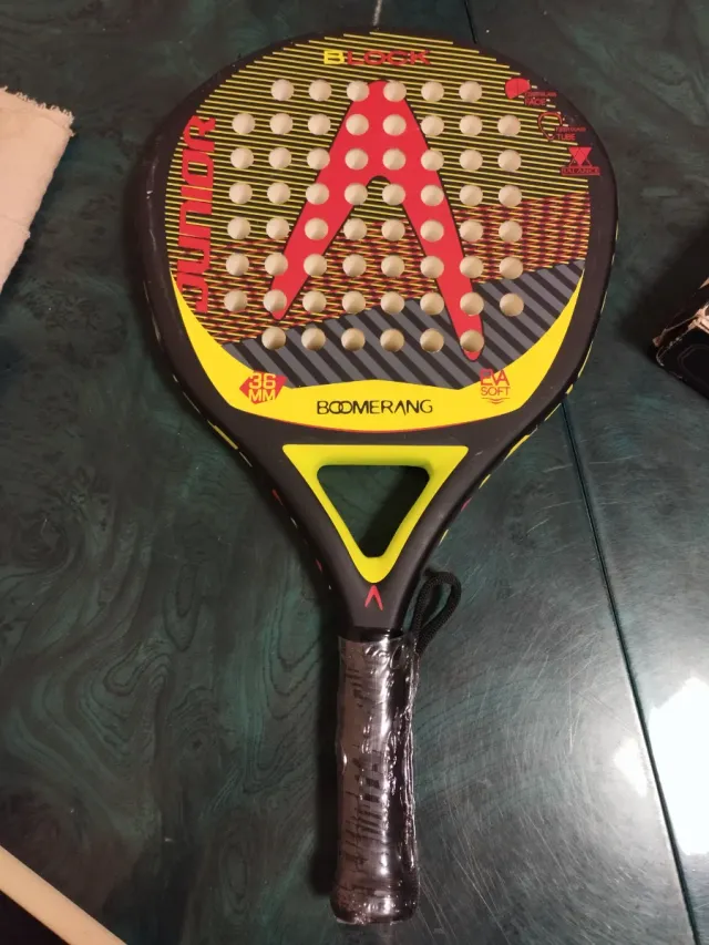 Detalles del productoPala de pádel con diseño llamativo en negro, amarillo y rojo.