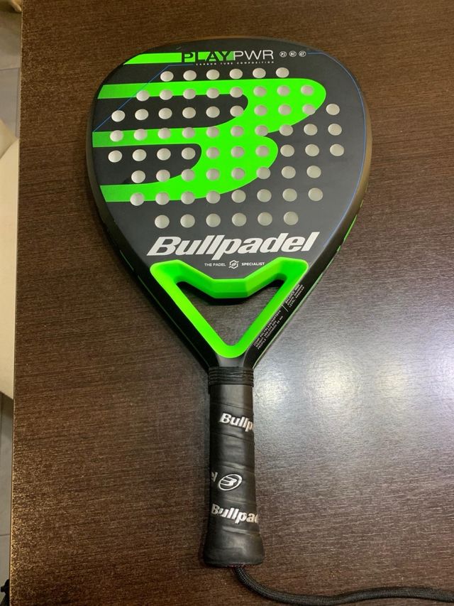Detalles del productoPala de pádel Bullpadel, utilizada únicamente para probarla. Presenta un diseño moderno en negro y verde.