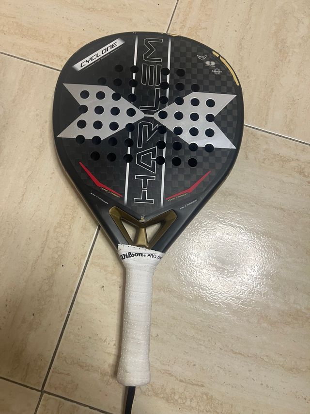 Pala de pádel Harlem Cyclone con diseño moderno y acabado en carbono. - Marco de carbono. - Superficie con patrón de agujeros. - Grip Wilson Pro Overgrip.