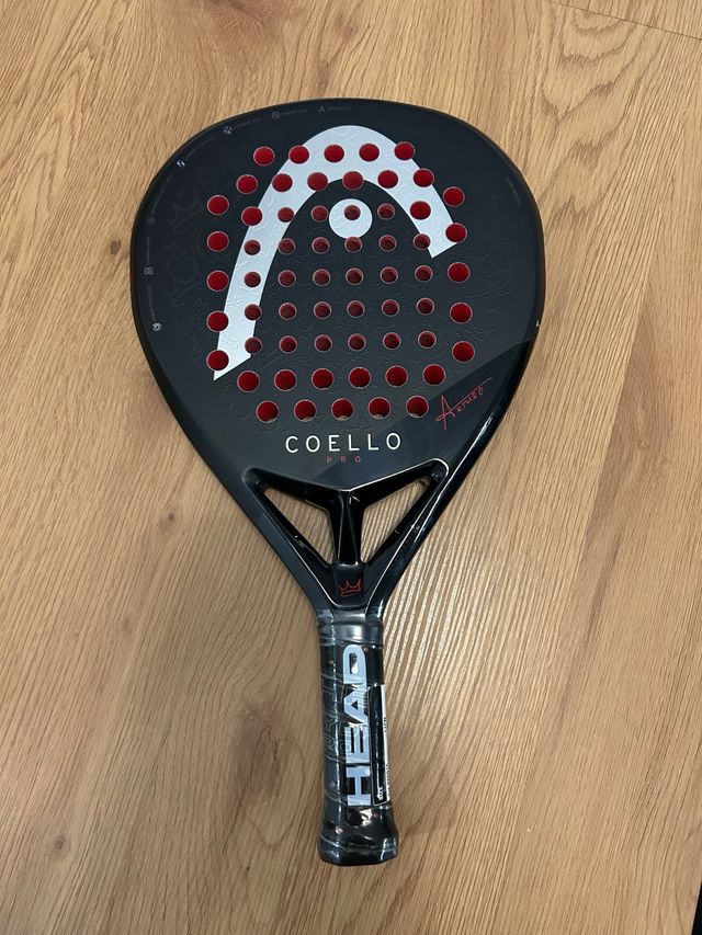 Pala de padel Head Coello Pro. - Diseño en color negro con detalles en rojo. - Logo de Head en plateado. - Nombre del modelo 'COELLO PRO' visible.