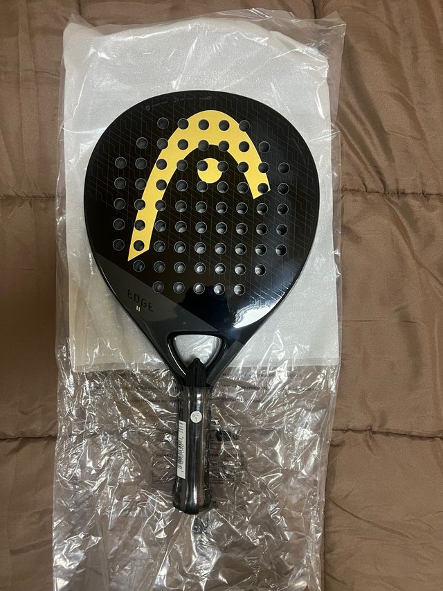 Pala de pádel HEAD Edge II en color negro y detalles dorados. - Diseño moderno con el logo de HEAD. - Superficie con múltiples agujeros. - Empuñadura ergonómica.