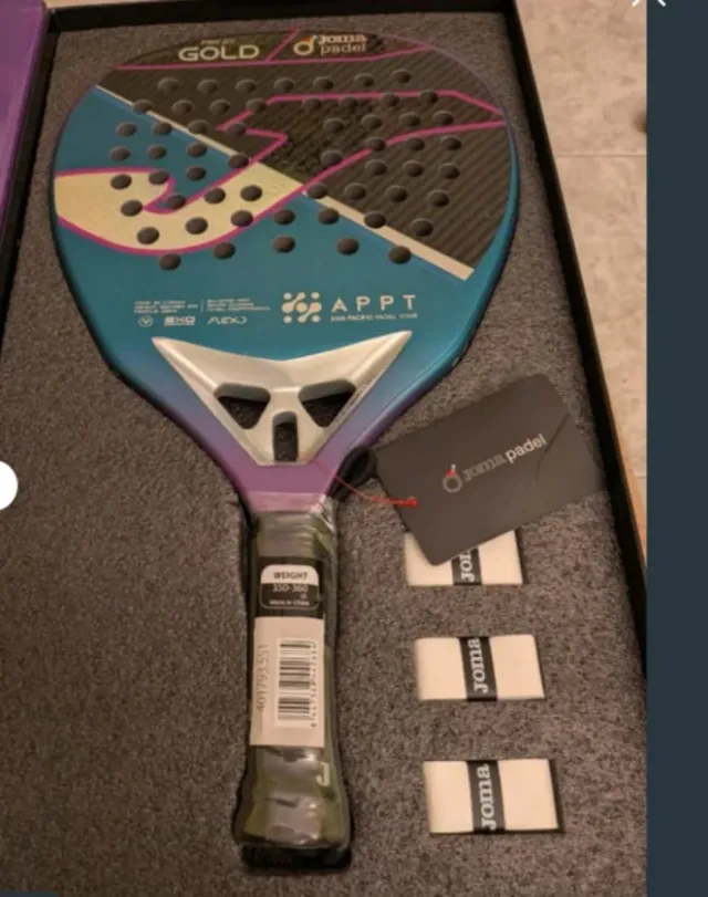 Pala de pádel Joma Gold APPT con un diseño moderno y llamativo. - Pala de pádel Joma. - Modelo Gold APPT. - Incluye 3 overgrips Joma.