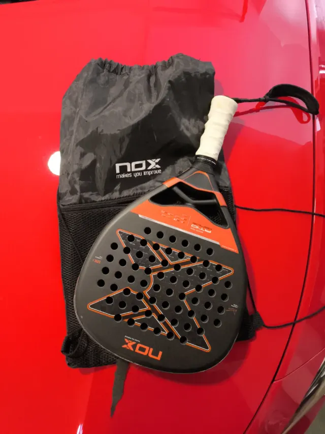 Pala de pádel NOX en color negro y naranja, con funda incluida.