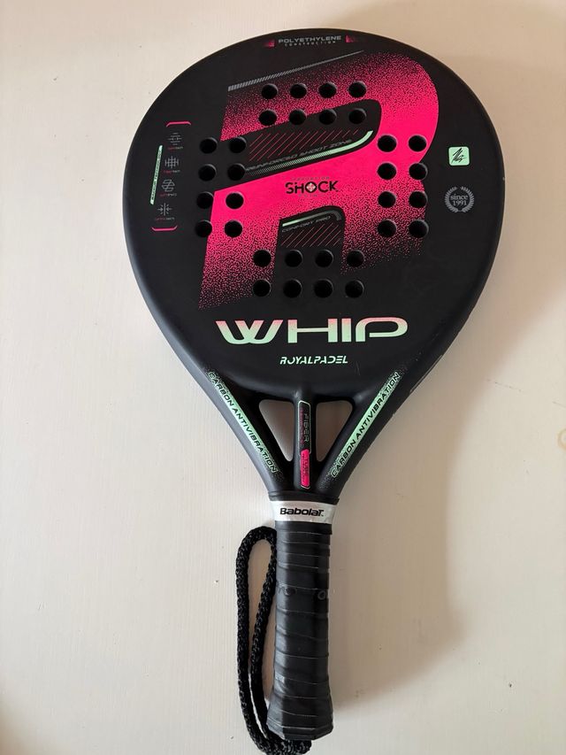 Detalles del productoPala de pádel Royal Padel Whip con diseño en negro y detalles en rosa.