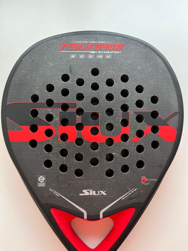 Detalles del productoPala de pádel Siux Tsunami Revolution con acabado en carbono.