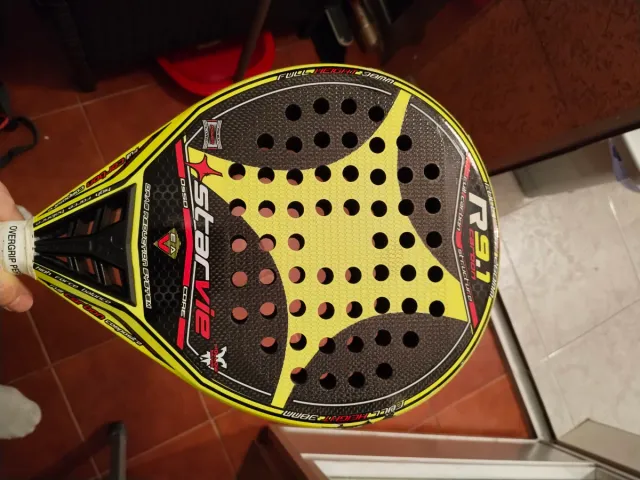 Detalles del productoPala de pádel Star Vie R9.1 con acabado en carbono y detalles en amarillo. Golpe en el lateral, no afecta al juego.