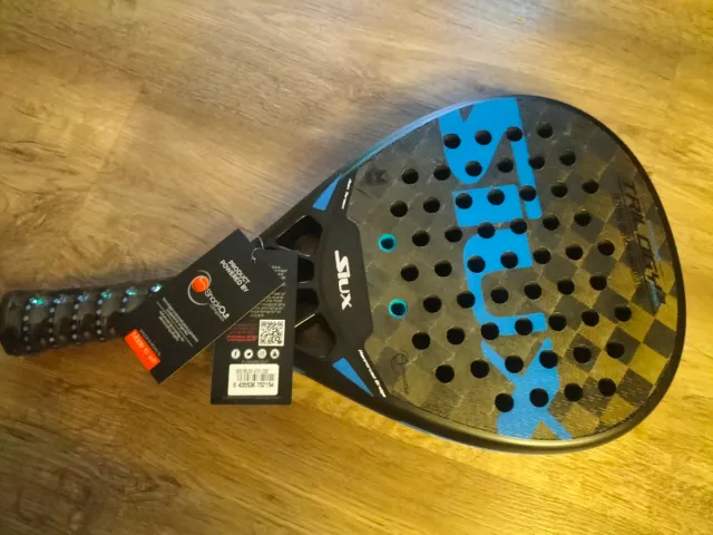 Pala de pádel Stux Trilogy con diseño moderno. - Pala de pádel Stux Trilogy. - Diseño con detalles en azul y negro. - Superficie con agujeros. - Empuñadura con grip.