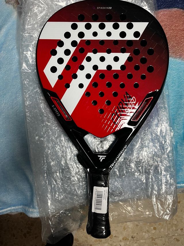 Pala de pádel Tecnifibre con diseño X-Speed. - Superficie con tecnología SpinSkin 3D. - Marco negro con detalles en rojo y blanco. - Logo de Tecnifibre en el puño.
