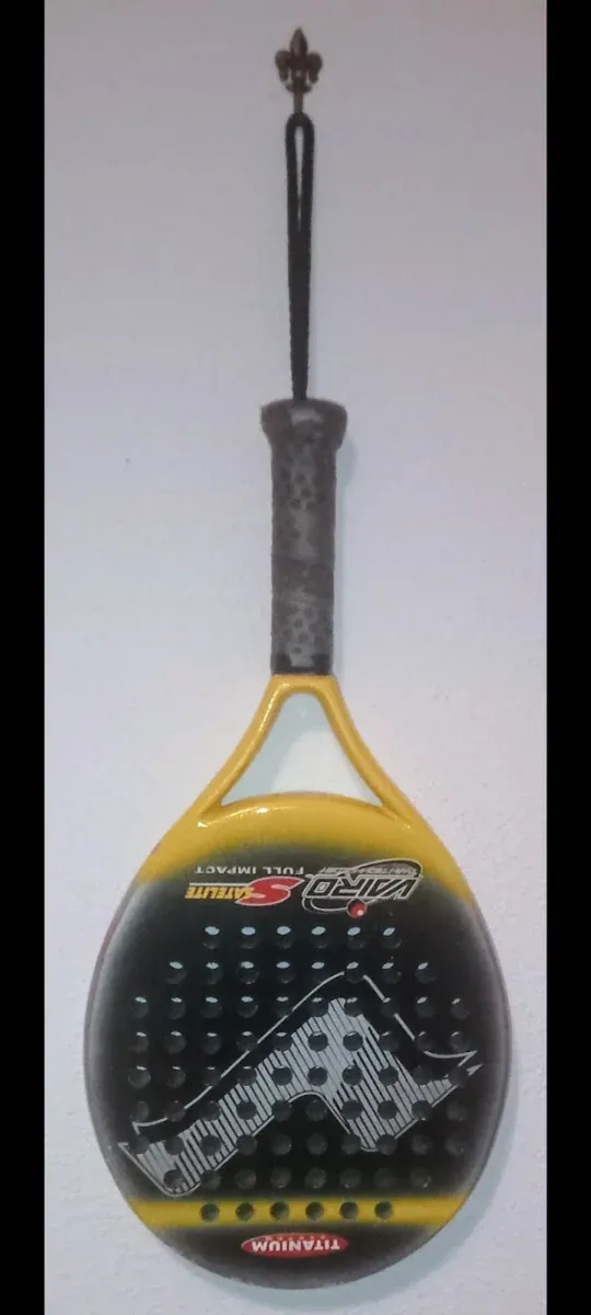 Detalles del productoPala de pádel Vairo SATELLITE con diseño en negro y amarillo.