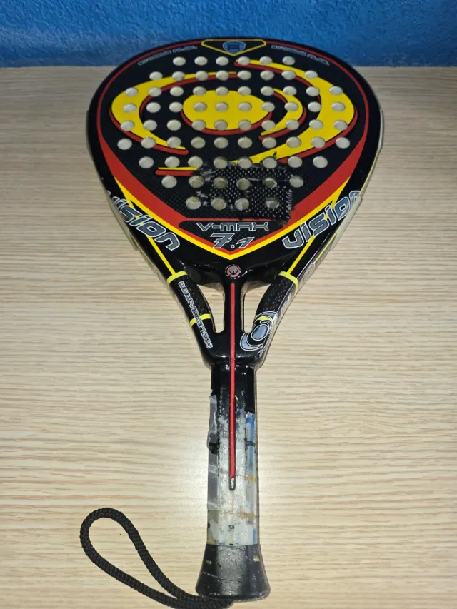 Detalles del productoPala de pádel Vision V-MAX 7.1 con diseño llamativo en negro, amarillo y rojo. Ideal para jugadores que buscan control y potencia.