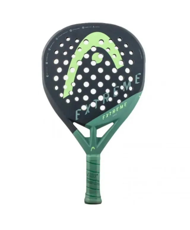 Pala de pádel Head Extreme Pro modelo 2023. - Diseño en negro y verde lima. - Logo de Head en la cara. - Grip verde.