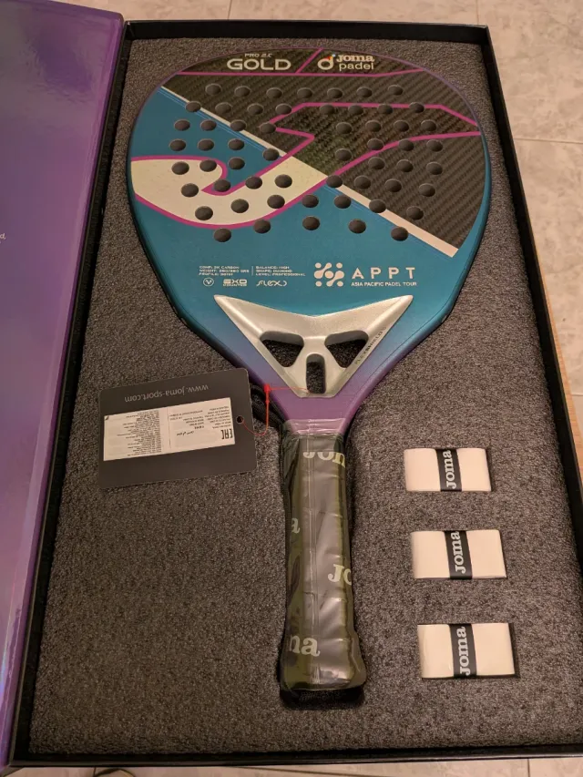 Pala de pádel Joma Gold Pro 2.0. - Diseño con acabado degradado azul y morado. - Superficie con patrón de agujeros. - Incluye tres grips de Joma.