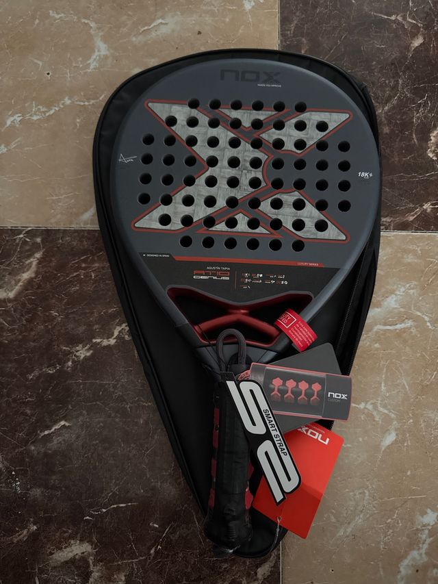 Detalles del productoPala de pádel Nox Agustín Genius 18K, diseñada para un juego de alto rendimiento. Incluye funda protectora.