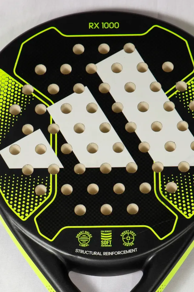 Pala de pádel Adidas RX 1000. - Diseño con acabado negro y detalles en amarillo neón. - Superficie con agujeros. - Logo de Adidas en blanco.