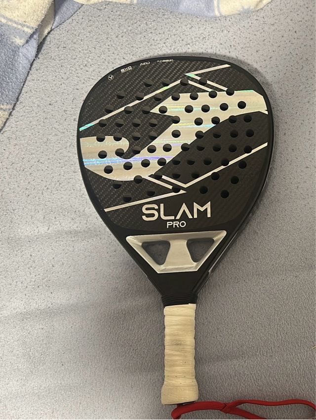 Detalles del productoPala de pádel marca Joma, modelo SLAM PRO. Diseñada con un acabado en carbono y detalles holográficos.